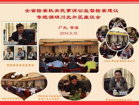 5月13日,全省检察机关民事诉讼监督检察建议专题调研川北片区座谈会在我市苍溪县召开,四川省检察院党组成员、副检察长夏黎阳主持会议,省院副巡视员李顺江、刘刚及省院民行处处长刘勃等参加了座谈并作了重要讲话。来自德阳、绵阳、阿坝、成铁等检察院的民事行政检察工作分管领导、部门负责人以及我市两级检察院民行检察业务骨干共计40余人参加了座谈调研。
