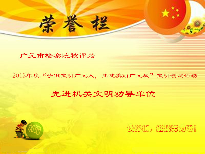 2月19日,广元市委办公室、广元市人民政府办公室联合发出《关于表扬2013年度“争做文明广元人,共建美丽广元城”文明创建活动先进单位的通报》,市检察院获评先进机关文明劝导单位。