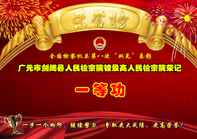 4月23日,最高人民检察院召开全国检察机关队伍建设座谈会,表彰全国检察机关第八次“双先”评选活动产生的先进集体和先进个人。剑阁县人民检察院榜上有名,被荣记“一等功”。这是该院继全国检察机关第五次“双先”表彰被荣记“一等功”后再次获此殊荣。