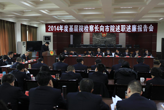 为加强市院对基层院检察长的管理和监督,促进基层院领导班子和领导干部队伍建设,推动检察工作科学发展,2月13日,市院召开了2014年度基层检察院检察长向市院述职述廉报告会。会议由张树壮检察长主持,市院领导班子成员、检委会专职委员、各基层院检察长、市院各内设机构负责人及述职述廉基层院政治处主任参加了会议。