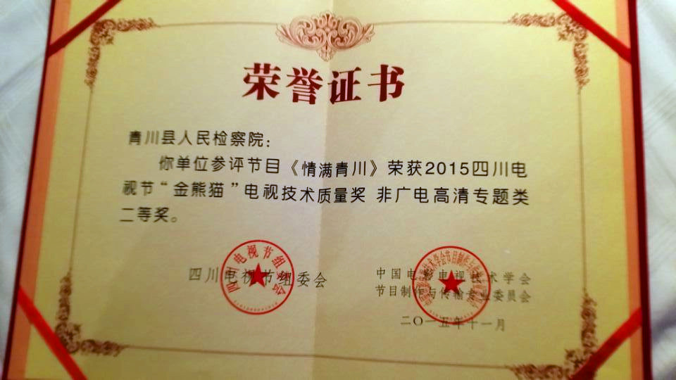 11月8日,由国家新闻出版广电总局、四川省政府主办,省新闻出版广电局、四川广播电视台承办的2015(第十三届)四川电视节圆满闭幕。青川县检察院选送的微电影《情满青川》在此次电视节上载誉而归,获得“金熊猫”电视技术质量奖非广电高清专题类二等奖、非广电专题音频类三等奖。