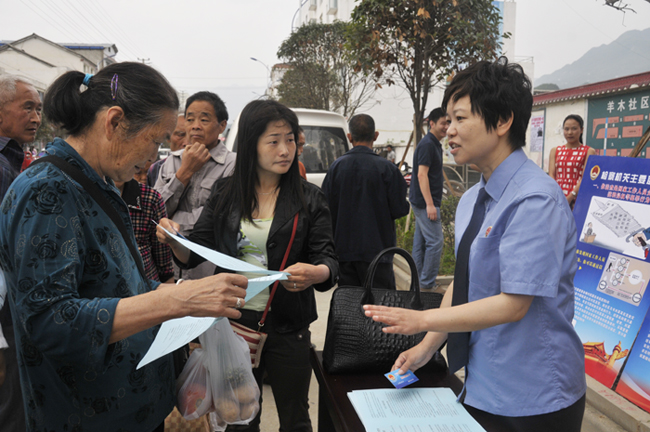 宣传活动中,朝天检察院宣传干警王娜介绍,目前朝天检务公开宣传活动在一周内已走遍区上6个乡镇,剩余19个乡镇,朝天检察院积极总结上周宣传活动经验,在展示职能职责展板、现场解说、分发阳光检务卡的基础上,创新宣传方式,结合逢场天向群众广泛性的做宣传同时,再开设宣传专场,向特定对象有针对性的开展宣传活动。因此在羊木镇就针对村、镇干部开展检务公开宣传、召开预防职务犯罪讲座,充分利用当地干部的群众缘,让干部在宣传活动中的所知所学,以群众喜闻乐见的方式再介绍给当地群众,从而让检务公开活动真正的深入群众、让活动内容家喻户晓。