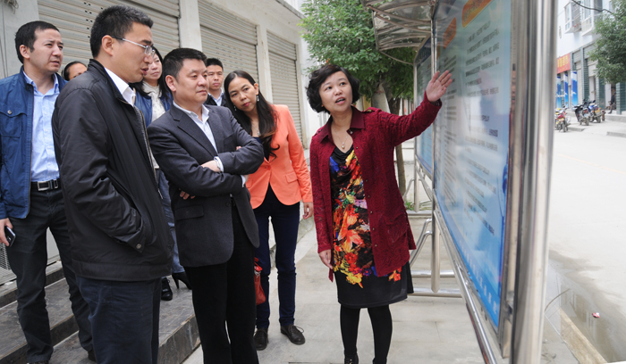 图说:朝天院检察长李红向省院朱检和市院张检等介绍羊木检察室设置的宣传展板