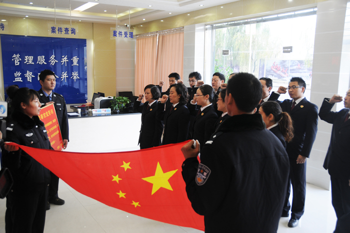 “我是中华人民共和国检察官,我宣誓:忠于祖国,忠于人民,忠于宪法和法律,忠实履行法律监督职责,恪守检察职业道德,维护公平正义,维护法制统一……”在新落成的阳光检务大厅,20名检察干警在检察长李红的领誓下,身着检察制服,高举右拳面向国旗郑重宣誓。检察干警通过宣读检察官誓词表达了对宪法和法律的尊重,对国家和人民肩负的重大使命,进一步增强了责任感和使命感,提高了检察干警的忠诚意识、廉洁自律意识。宣誓后,全体人员在“弘扬宪法精神、履行检察使命”的横幅上一一签名,牢记使命和誓言。