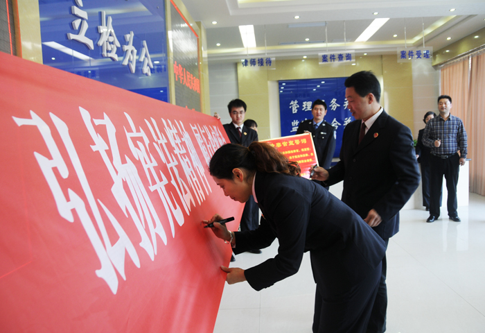 李红检察长表示,今天组织宣誓和签名活动,旨在全面贯彻落实十八届四中全会关于“建立宪法宣誓制度”有关要求,并希望通过这样的活动更好地强化检察干警忠于宪法和法律意识,恪尽职守,承担起维护社会公平正义的神圣使命,时刻牢记肩负的责任。”