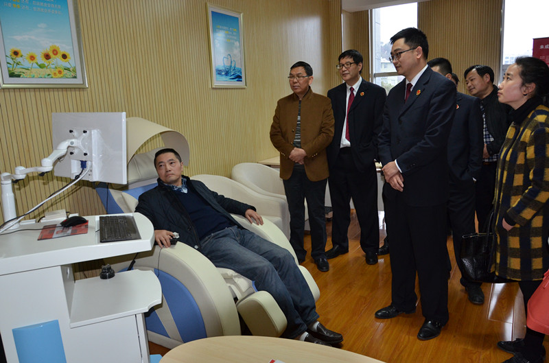 罗江处长一行实地查看了利州区院法治文化广场、控申和案管接待大厅、检察业务综合办案区、未检办案区,对利州区院依托“两房建设”整体推进办案区建设的情况进行详细指导,充分肯定利州区院“办公办案相分离,突出科技化信息化”的办案区建设思路和做法。在未检办案区,罗江处长体验了“生物反馈仪”、“心理测试”、“智能宣泄”等心理设施设备的运用,查看了“虚拟方阵”在吸引未成年人注意力上的特色功能以及使用iPad进行个性化预防的情况。