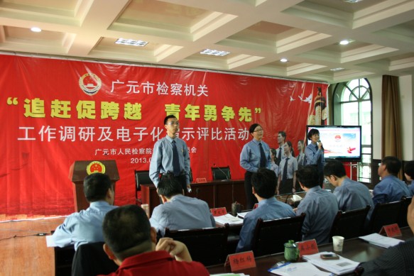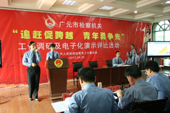 我院接到市院关于开展“追赶促跨越、青年勇争先”工作调研及电子化演示活动的通知后,院党组高度重视,党组书记、检察长解占泽要求一定要组织全院年轻精干力量积极参加,要有勇争第一的态度,发挥主观能动性,深挖潜力,切实做好这次调研及电子化演示活动。随后,我院成立了以党组成员、政治处主任蒲建新为组长的调研小组,多次深入广元监狱实地调研,确定了以在押精神病犯刑罚执行监督中存在的问题作为本次调研主题。全院35岁以下所有工作人员参加调研,各展其长,分工合作,密切配合,最终在4月30日全市检察机关的“追赶促跨越、青年勇争先”工作调研及电子化演示活动中成功演示,获得优秀奖,并受到广泛好评。